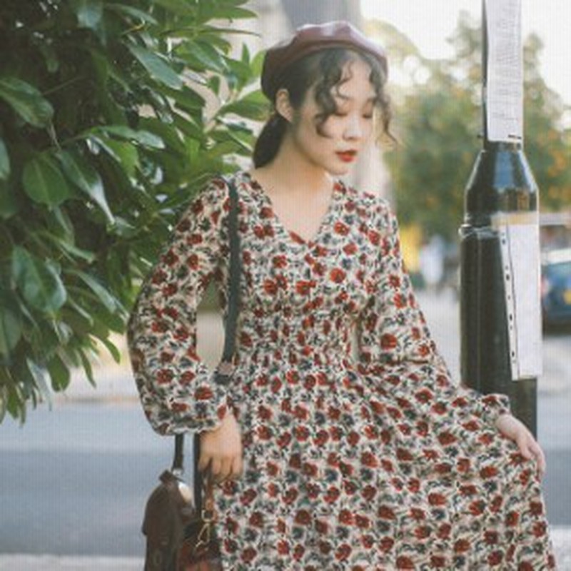 ワンピース 長袖 花柄のワンピース レトロ小花柄ワンピース フラワープリント ワンピース フレアワンピース 長袖 膝下ワンピース デート 通販 Lineポイント最大get Lineショッピング
